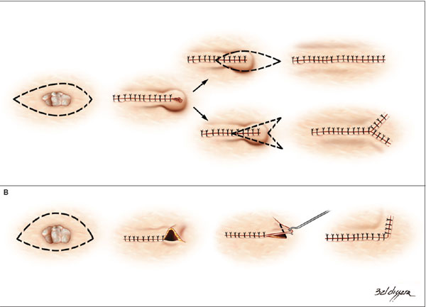 Fig. 7.4 - Métodos para retirada das “orelhas de cachorro” causadas por excisão fusiforme muito curta (que não segue a regra de 3:1 ou 4:1). A. A “orelha de cachorro” situa-se em ambos os lados de uma mesma ponta; prolonga-se a incisão com reparação das “orelhas de cachorro”; prolonga-se menos a incisão fazendo 2 fusos a 45o de ambos os lados. B. Quando o excesso de pele (“orelha de cachorro”) ocorre só de um lado da incisão, retira-se esse excesso, prolongando a incisão a 90o.