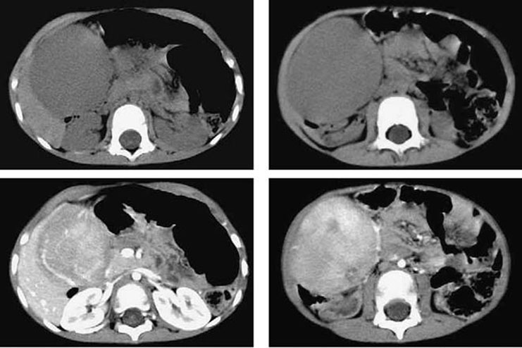Figura 69-1. Tomografia computadorizada do abdome superior realizada em cortes axiais evidencia volumosa formação expansiva intraperitoneal, circunscrita, de contornos regulares, hipoatenuante na fase sem contraste e que apresenta importante realce na fase arterial.
