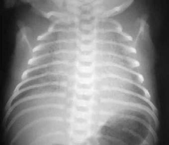 . Opacidade pulmonar bilateral, simétrica, difusa. Observe os broncogramas aéreos.